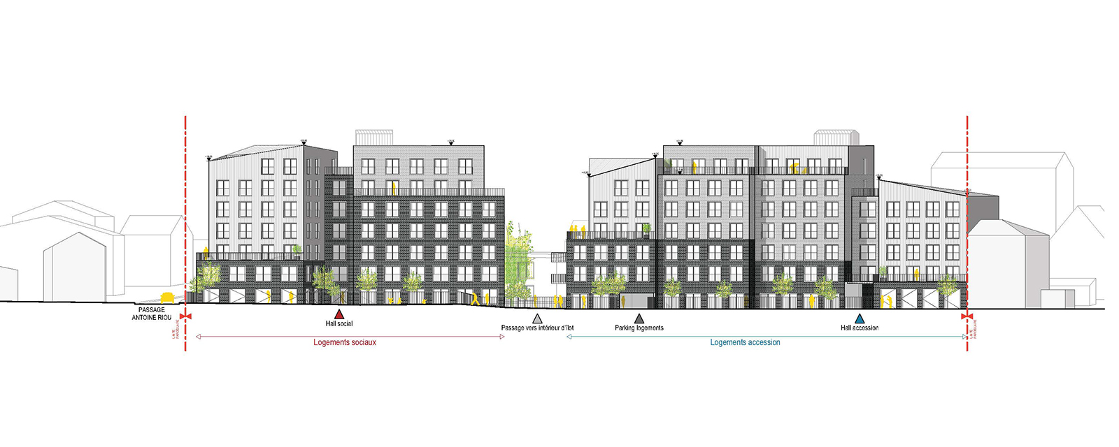 Au-dessus, le rythme ordonné des ouvertures de façades en brique, réhaussées d’attiques variées en bois ou zinc assure la transition d’échelle avec les immeubles existants, notamment les habitations individuelles riveraines.