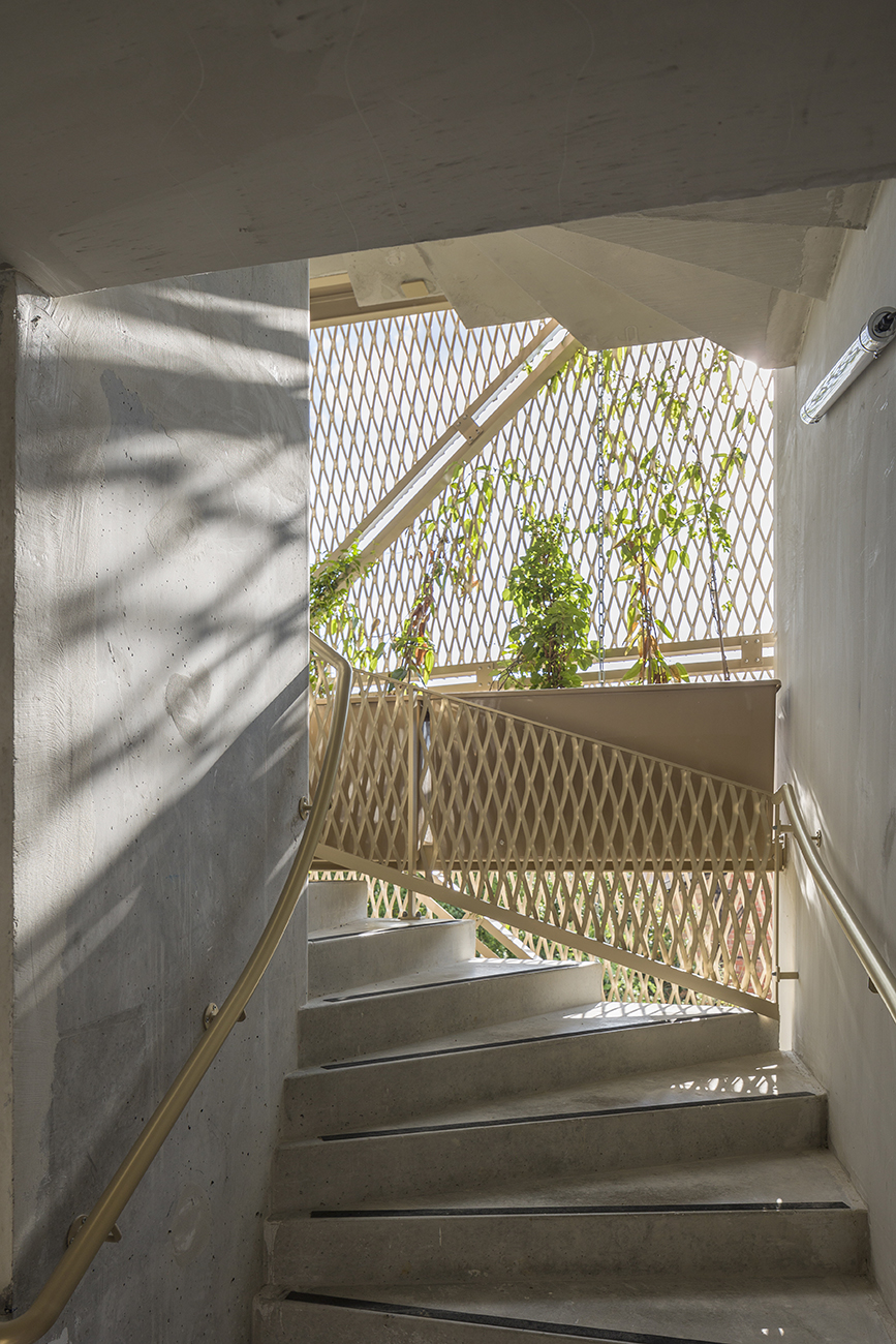 Cette résille en métal déployé couleur doré-champagne offre une vibration unique toute au long de la journée par les jeux d’ombres et lumière selon la courbe du soleil. Elle sert également de support aux espaces de végètalisation verticale.